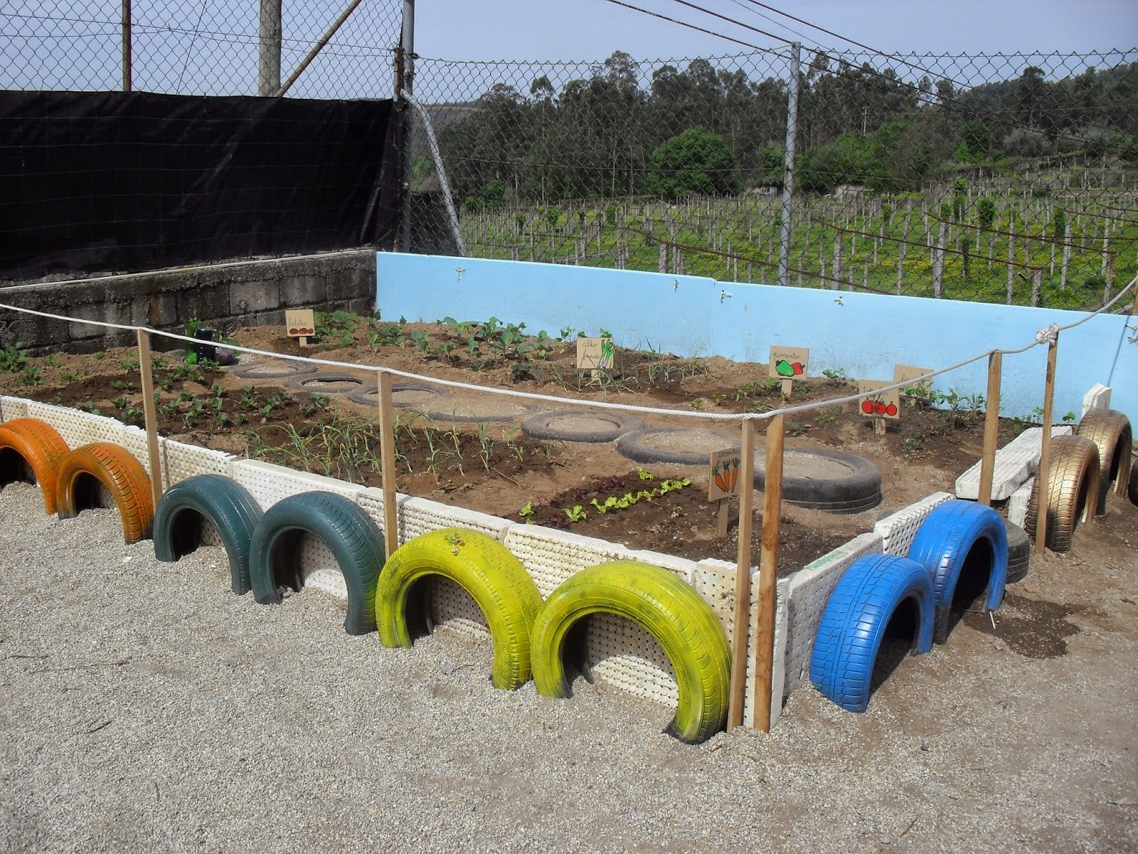 Este ano, demos uma nova imagem à nossa horta construída num espaço da escola. Pneus velhos foram reutilizados na vedação da horta tornando-a mais bonita e colorida. O senhor presidente da Junta, forneceu a terra e outros materiais necessários na sua construção.